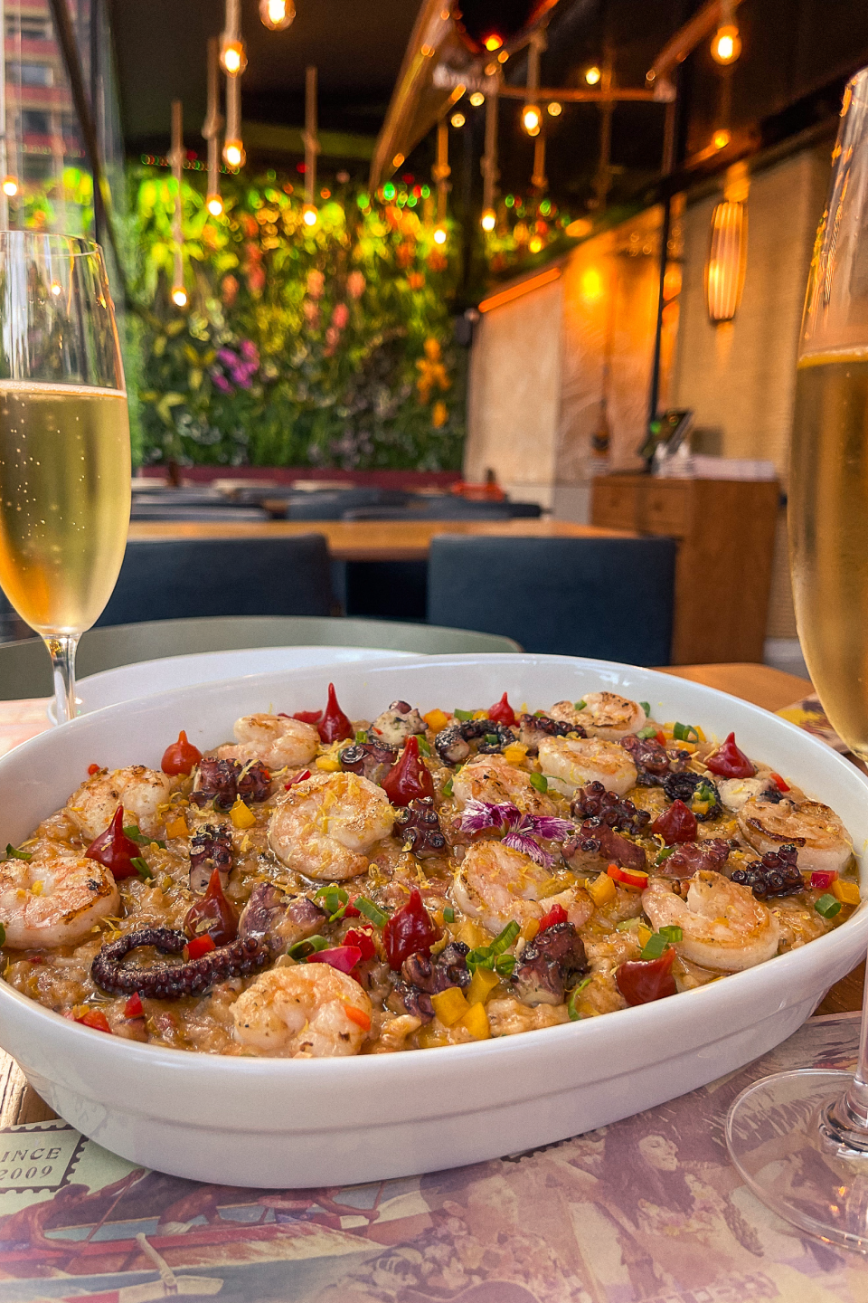 No cardápio, desde as entradas, um ampla variedade de opções.  Na lista dessas charmosas entradinhas você encontra bolinhos de risoto de queijos crocante, recheados com muçarela e geleia de pimenta; ou os dadinhos de tapioca com melaço. Mas também carpaccio, filé com  fritas, camarão gratinado ou polvo na manteiga. Os pratos para compartilhar a dois oferecem farngo, filet mignon ou camarão em diferentes versões. Você enconra ainda uma diversidade de drinks e vinhos.